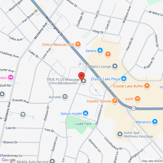 Map to Wellness Acupuncture (Community Appointments) Near W. Virginia Street (Route 14/NW Highway) and Coventry Lane. On the east side of Coventry Lane, just south of Lake Street.